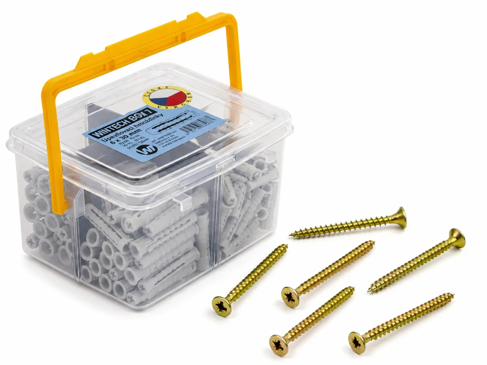 Praktický box se standardními hmoždinkami doplněný o přesně sladěné vruty. Nemusíte nic vybírat ani kombinovat – vše do sebe perfektně pasuje a je připraveno k okamžitému použití.